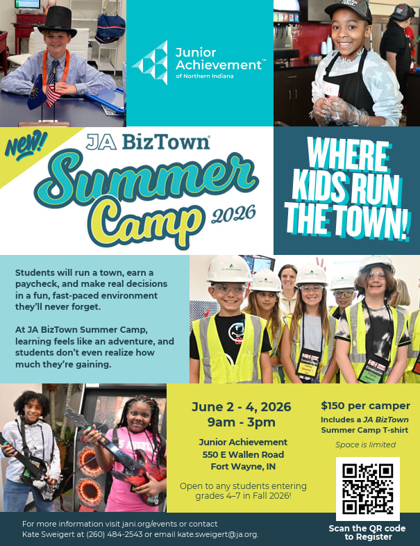 Registration is $150 per student. Every camper receives an exclusive JA BizTown Summer Camp T-shirt, plus plenty of time for friendship, laughter, and fun. This camp experience blends hands-on learning with leadership development, making it an unforgettable summer adventure for students in the Greater Fort Wayne area.