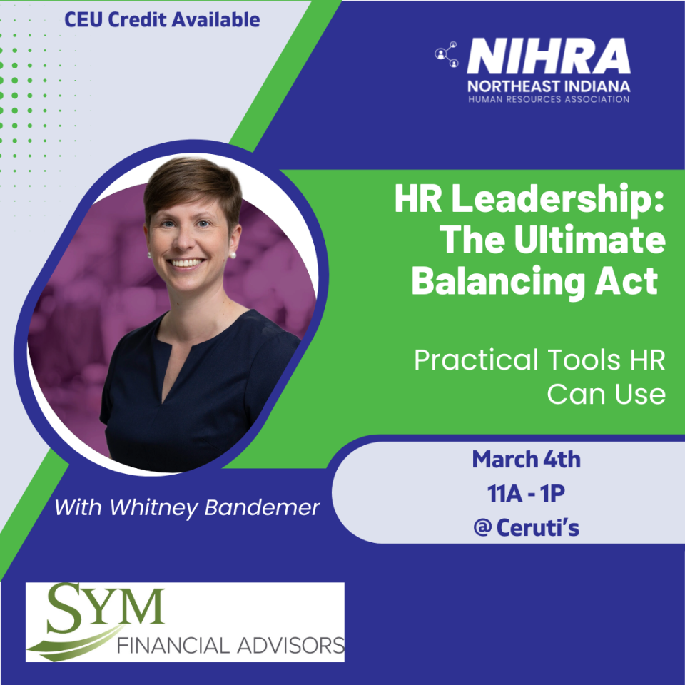 Join NIHRA as HR Leaders and Business professionals hear from Whitney Bandemer. Whitney will be presenting on the balancing act required by HR leaders between their humanity, individuality, and responsibility. Using practical examples we will examine 3 frameworks to help leaders be clear about what they will tolerate, the confidence to speak up, and the courage to follow-through with value-aligned action. Lunch will be provided with the presentation. Whitney's presentation will be CEU eligible.
